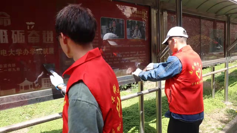 同学们穿上红色小马甲,带上手套,分散到校园的各个角落,捡拾垃圾,撕去张贴在墙上的小广告,全面清理各处卫生死角,劳动的身影成为校园里一道靓丽的风景。