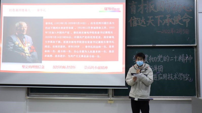 为了深刻理解党的二十大的历史地位和重要意义,探究伟大的建党精神和中国共产党人的精神谱系,孜乃提古丽·布尔汉老师采用讲述与提问相结合的宣讲方式,将这些精神与我们南邮的发展历史以及我校的红色基因相关联,讲述南邮人永远的精神丰碑——秦华礼老书记的故事,以及在抗日烽火中,在解放战争中,在顽强斗争中涌现出一批批的代表人物与战邮英雄的故事,传递了“忠贞不渝、使命必达”的战邮精神!