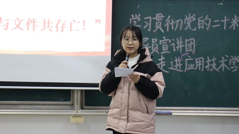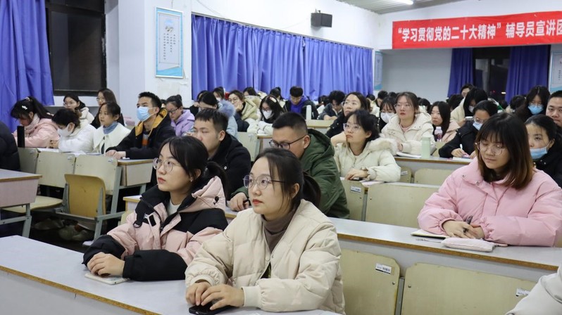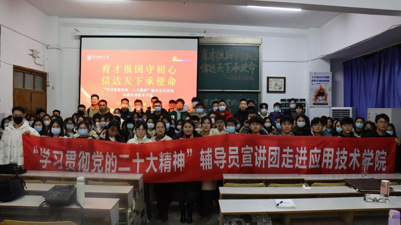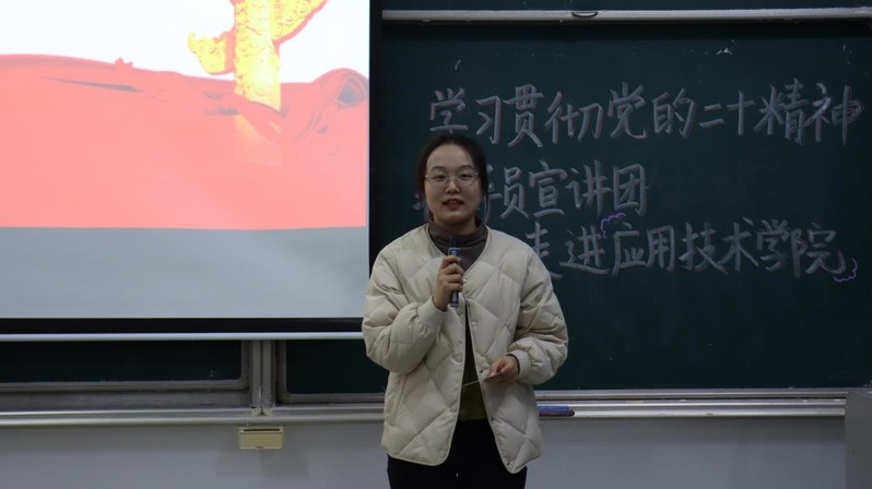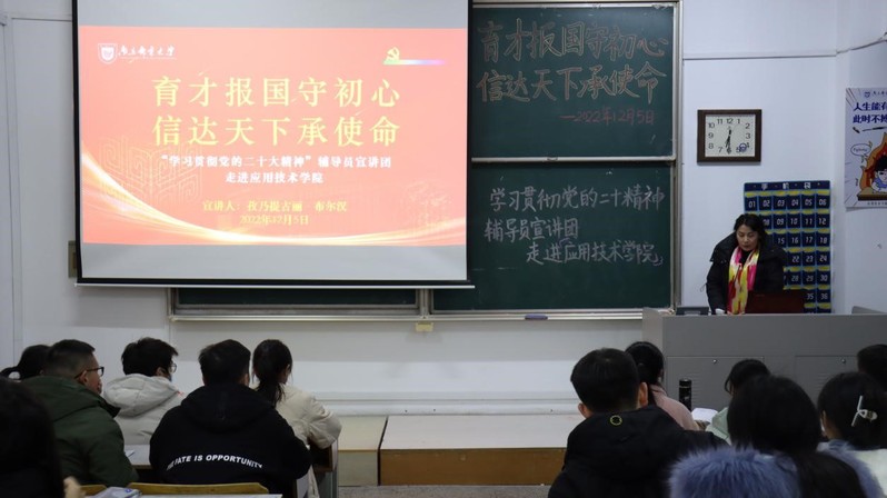 为深入学习领会和贯彻落实党的二十大精神,鼓舞广大青年学子为实现第二个百年奋斗目标而不懈努力,12月5日,应用技术学院于教学楼604教室召开了“育才报国守初心,信达天下承使命”主题宣讲会,我校“学习贯彻党的二十大精神”辅导员宣讲团成员、电子与光学工程学院辅导员孜乃提古丽·布尔汉老师,为同学们宣讲党的二十大精神。