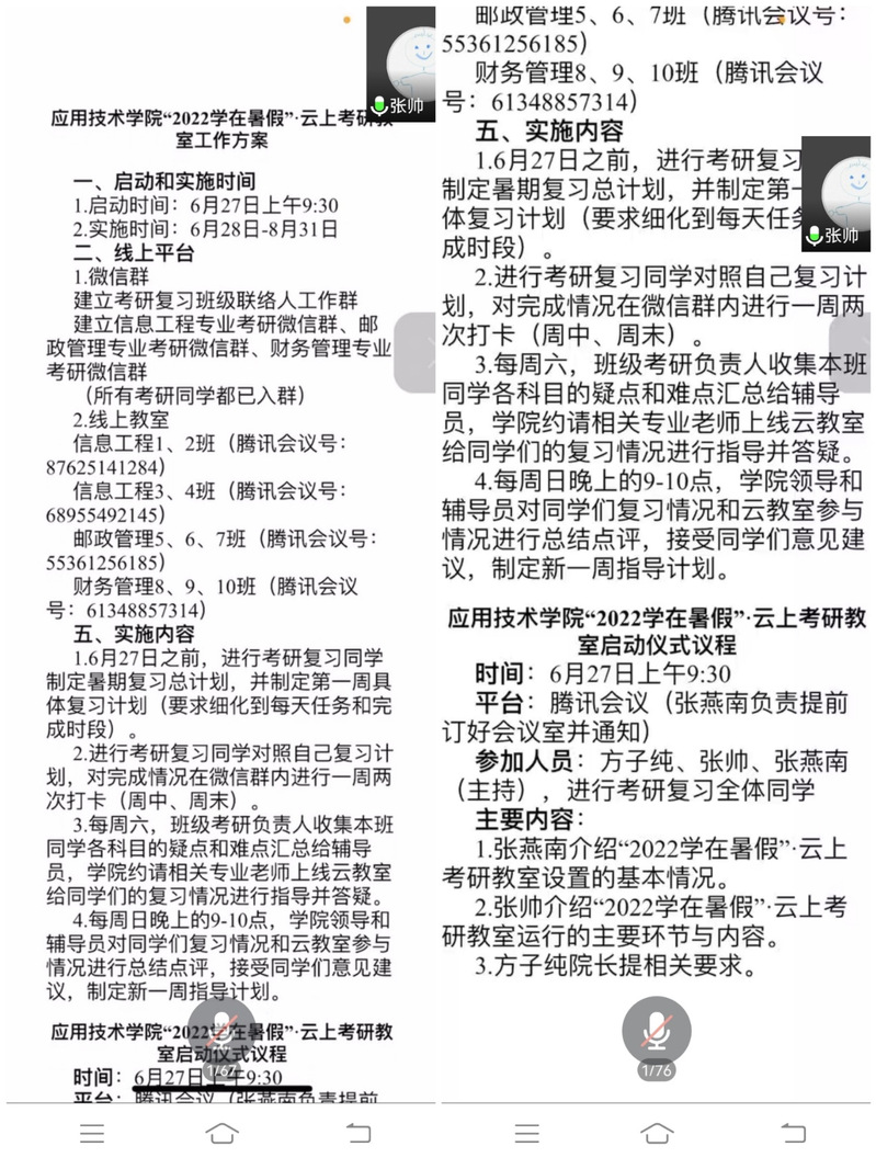 2022年6月27日上午9:30,应用技术学院“2022学在暑假”云上考研教室正式启动。启动仪式由院长方子纯,学院副书记、副院长张帅和19级辅导员张燕南主持,全体19届考研同学参加。