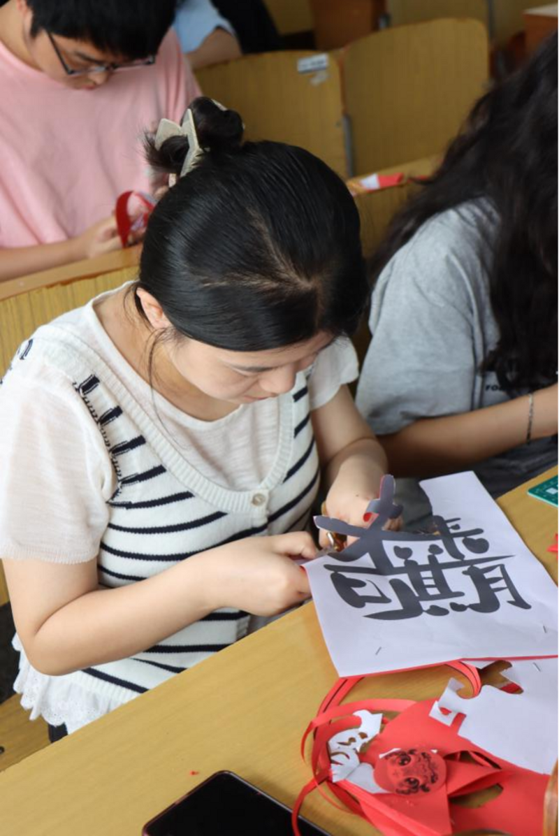 活动特别设置了校徽、院徽剪纸创作环节。用非遗技艺剪刻出校徽院徽,通过一刀一剪的精雕细琢,原本平面的徽章在红纸上焕发出新的生命力。“用剪纸重现校徽的过程,让我对学校的文化底蕴有了更深的理解。”回族同学马蕊感慨道。这些凝聚着学子深情的剪纸作品,将在学院科创活动室永久陈列,成为激励创新、传承文化的独特载体。